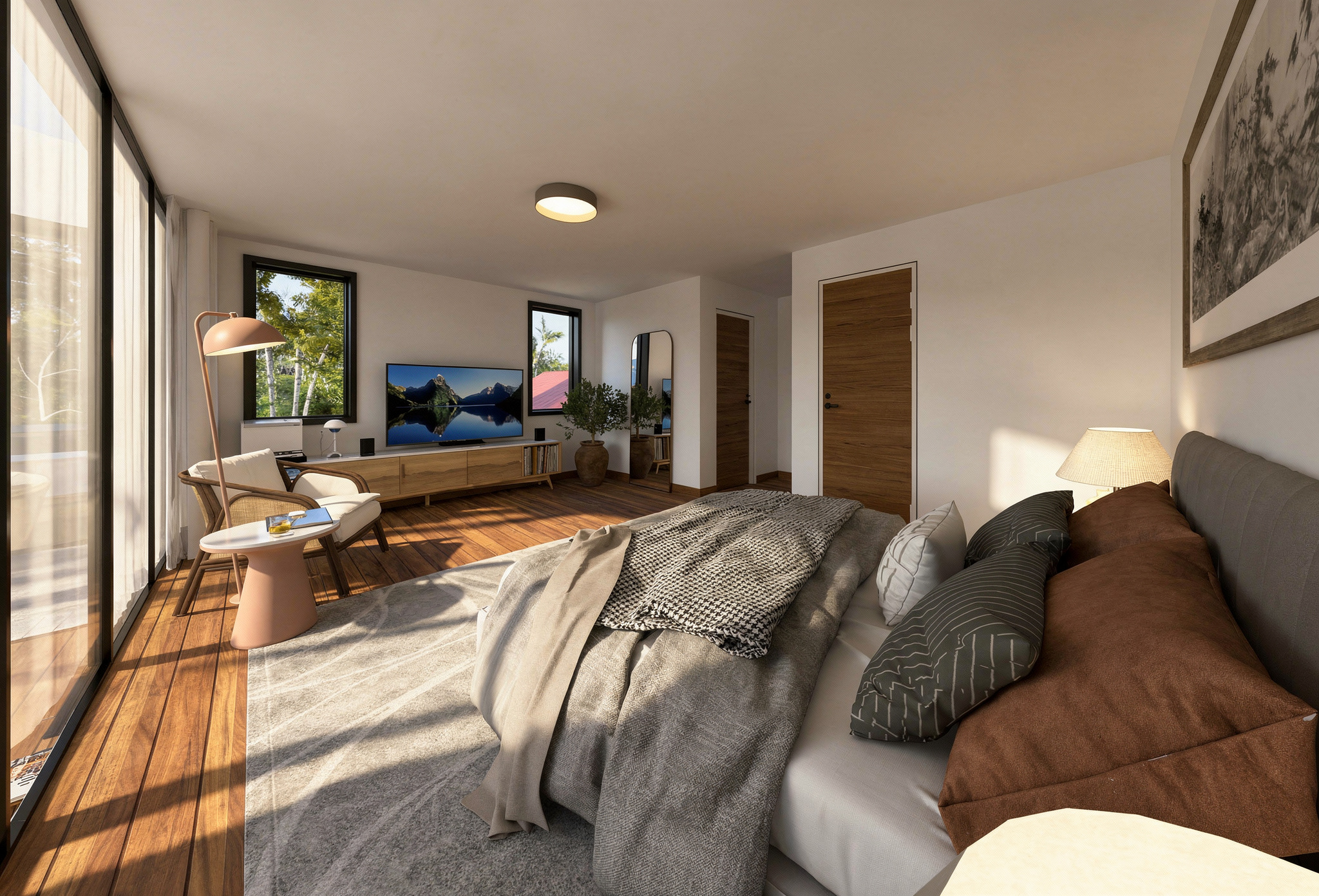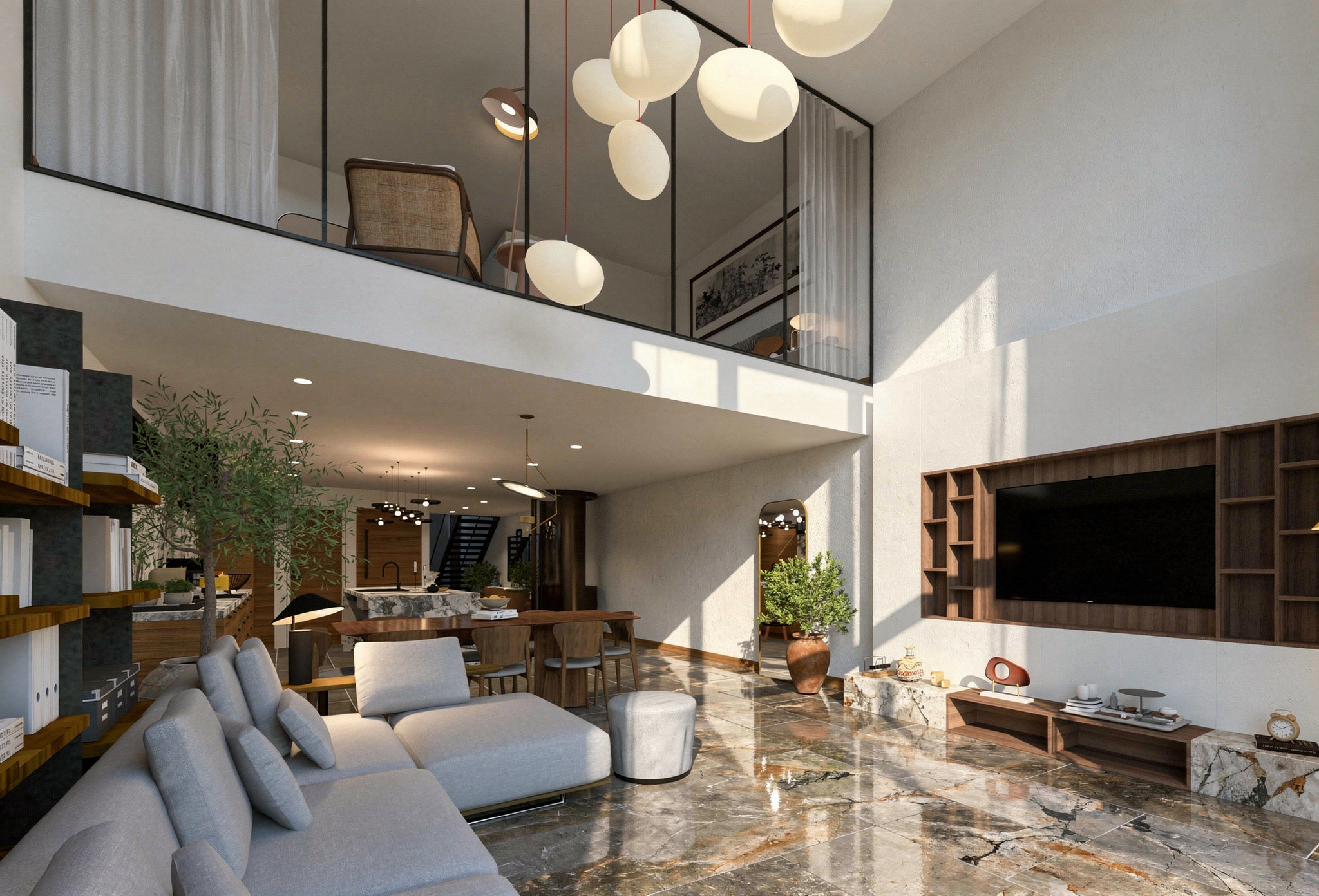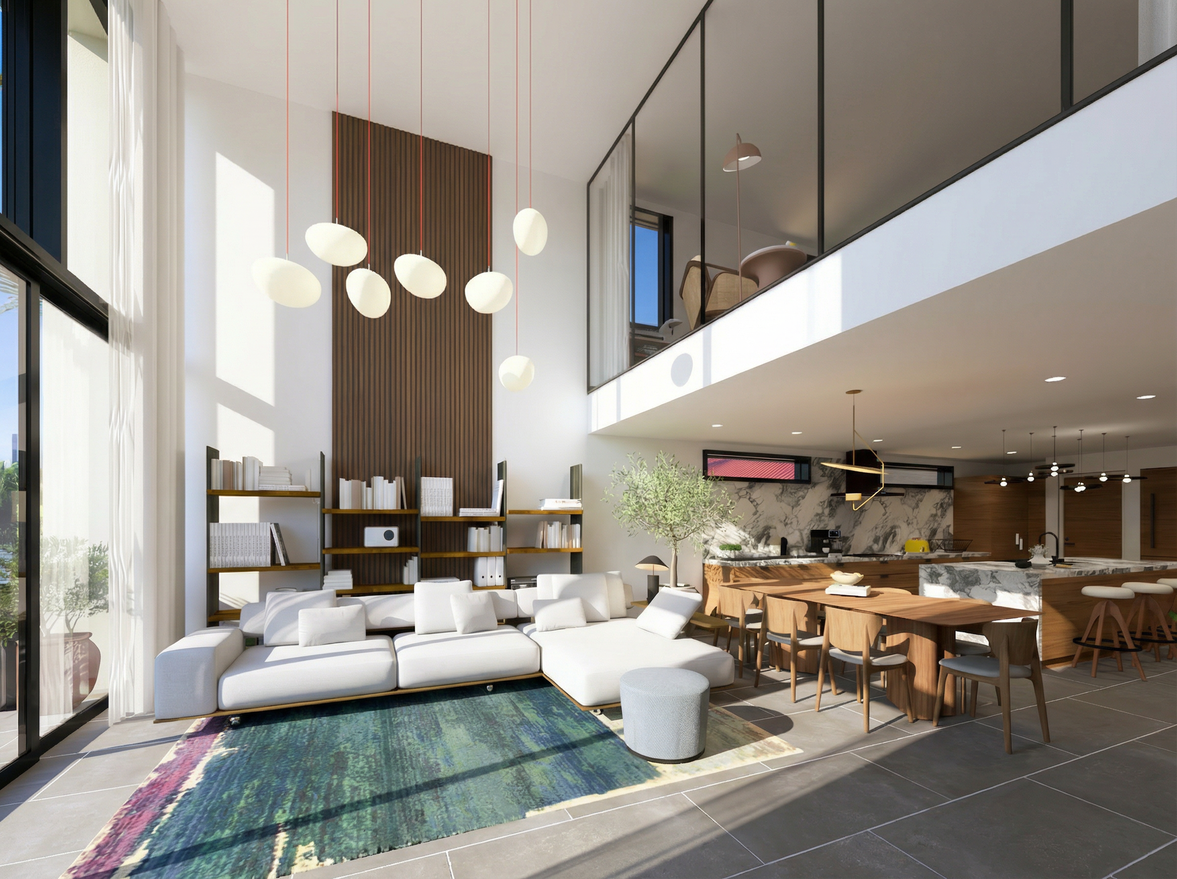 Each residence offers 4 bedrooms, 4 and 1 half bathrooms, and nearly 3,400 sq. ft. of interior living space. Large windows bring in natural light throughout the day, while double-height ceilings in the main living area create a sense of openness without feeling excessive.