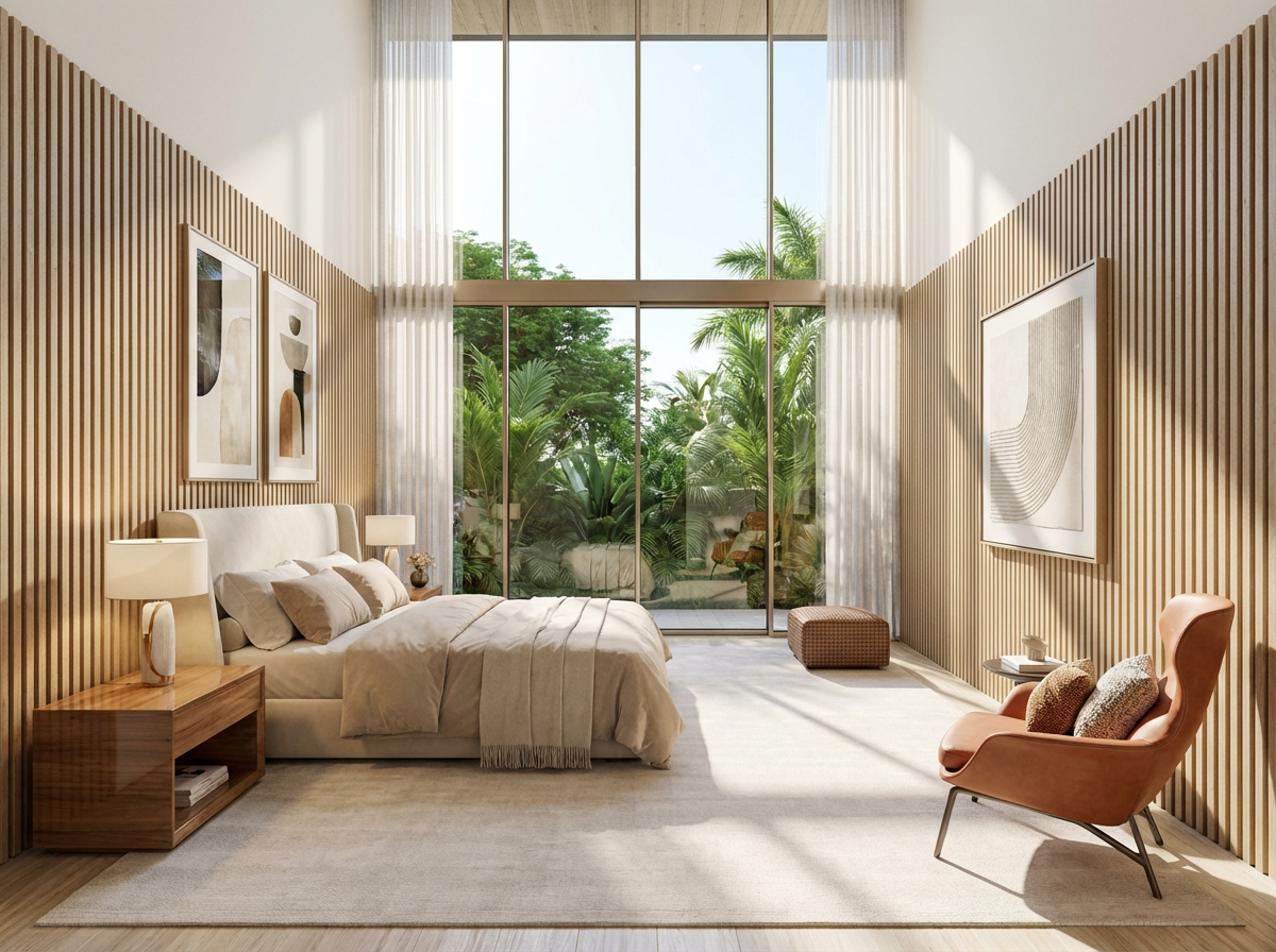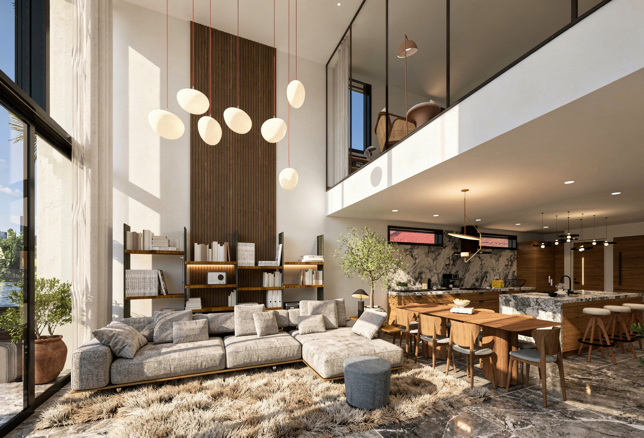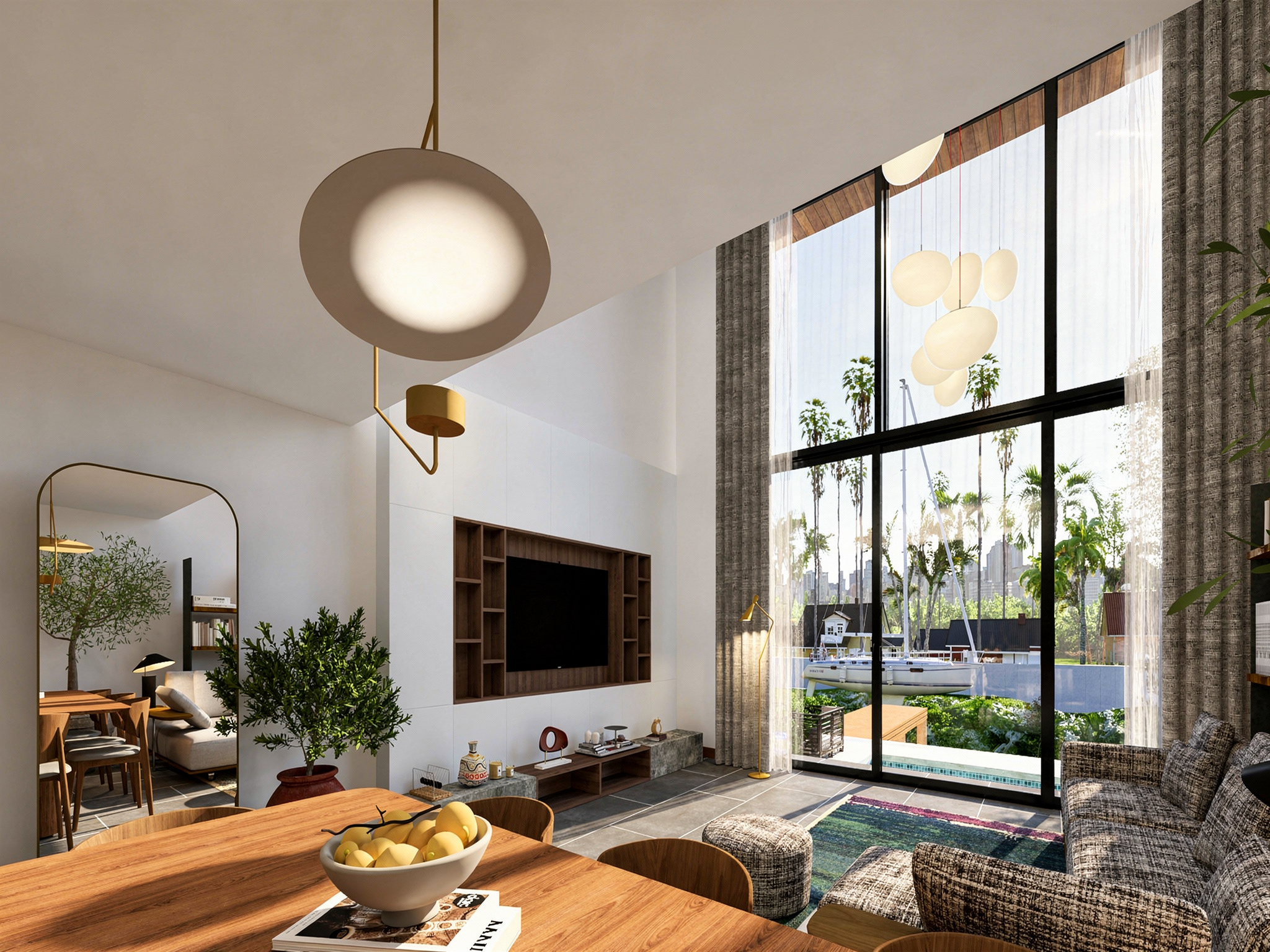 The kitchens are built for everyday use and entertaining, with high-end appliances and generous workspace. Outdoor areas include a private plunge pool, wraparound balconies, and a rooftop terrace with open views of the surrounding waterways and skyline. For boat owners, the private dock allows for a 50 ft. yacht with unrestricted ocean access and no fixed bridges.